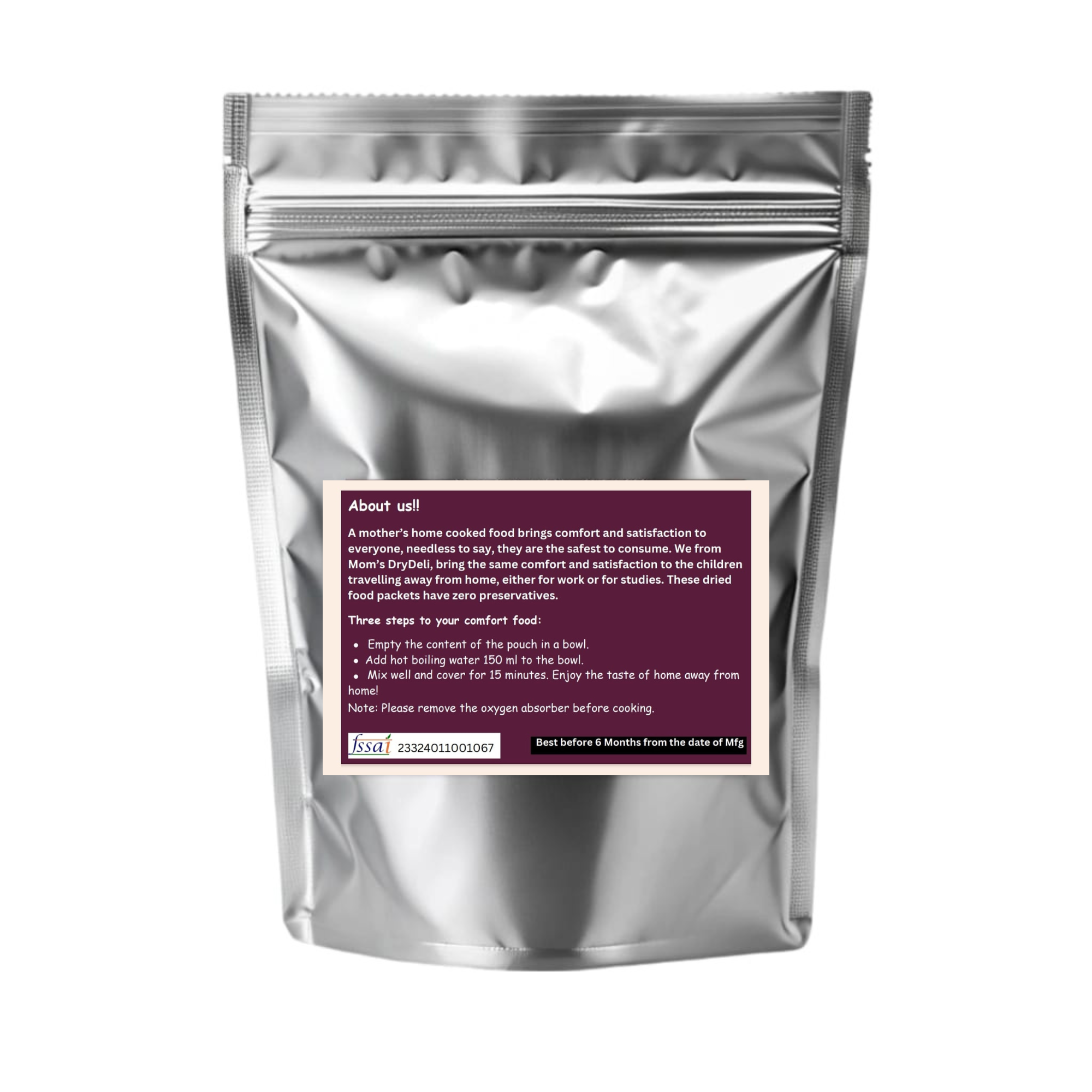 A mother’s home cooked food brings comfort and satisfaction to everyone, needless to say, they are the safest to consume. We from Mom’s DryDeli, bring the same comfort and satisfaction to the children travelling away from home, either for work or for studies. These dried food packets have zero preservatives.