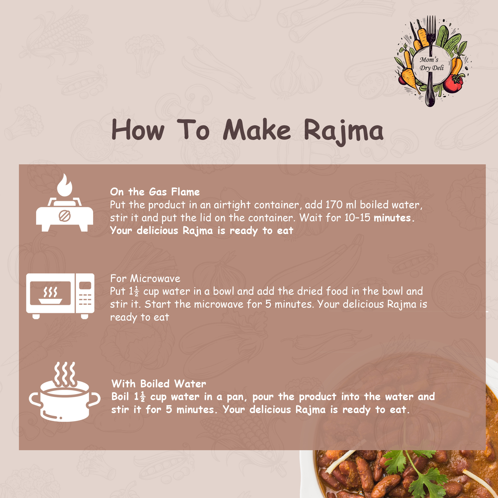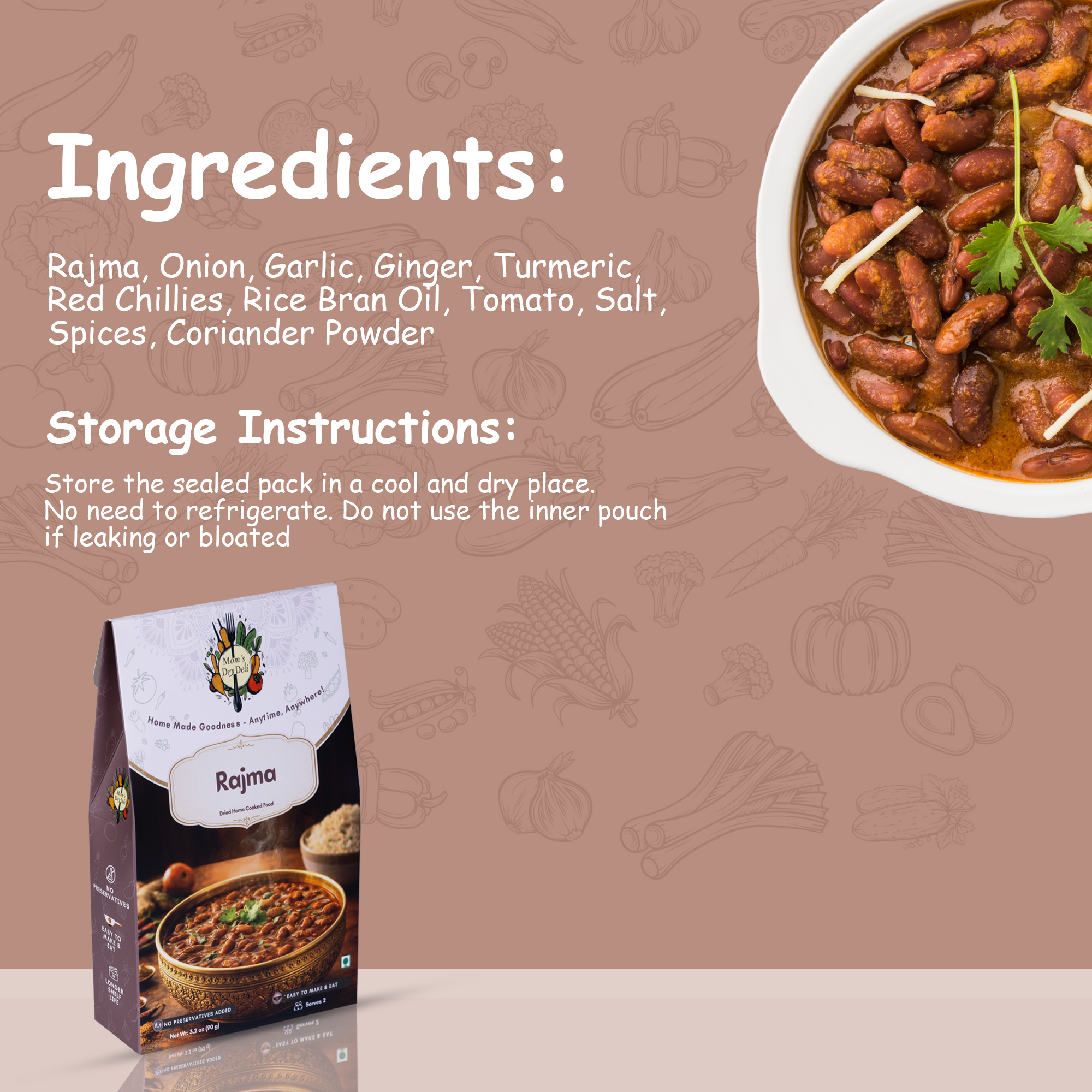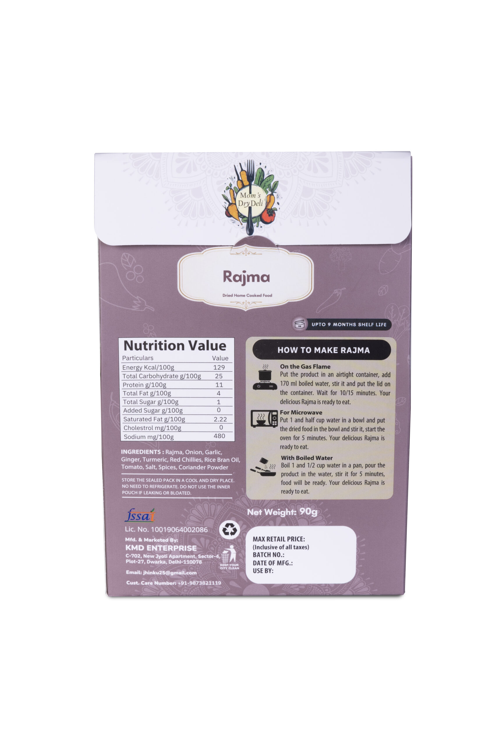 • How to Cook- Just add hot water and your wholesome Rajma is ready in minutes! Perfect for busy mornings, office lunches, travel, or hostel life.