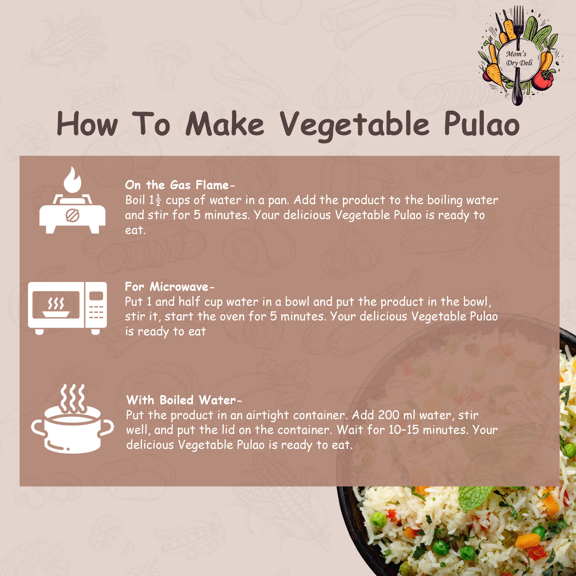 - How to Cook- Just add hot water and your wholesome Veg Pulao is ready in minutes! Perfect for busy mornings, office lunches, travel, or hostel life.